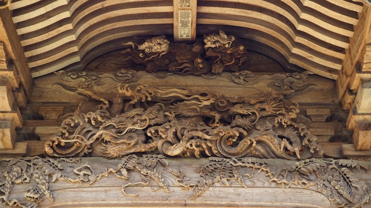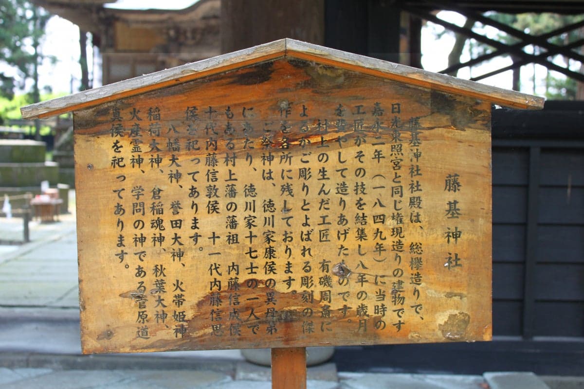 藤基神社社殿は、総欅造りで、日光東照宮と同じ権現造りです。嘉永二年(一八四九年)に当時の工匠がその技を結集し八年の歳月を費やして造りあげたものです。村上の生んだ工匠有磯周斎(ありいそしゅうさい)によるかご彫りとよばれる彫刻の傑作を各所に残しております。