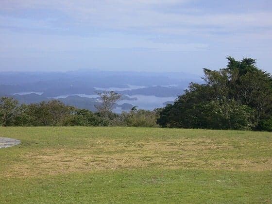 標高358mの展望台からは、日本の代表的溺れ谷、浅茅湾が箱庭のように眼下に広がり、遠く九州本土や韓国の山々が見える国境の島ならではの眺望です。