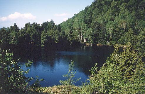 形は正三角形。志賀山からの湧水を湛えているため志賀高原でも最も透明度が高く、青味がかった色。周囲は亜高山帯に属する樹林に被われ、池畔は浅根性で日当たりを好むクロベ、アズマシャクナゲの群生が繁茂しています。
