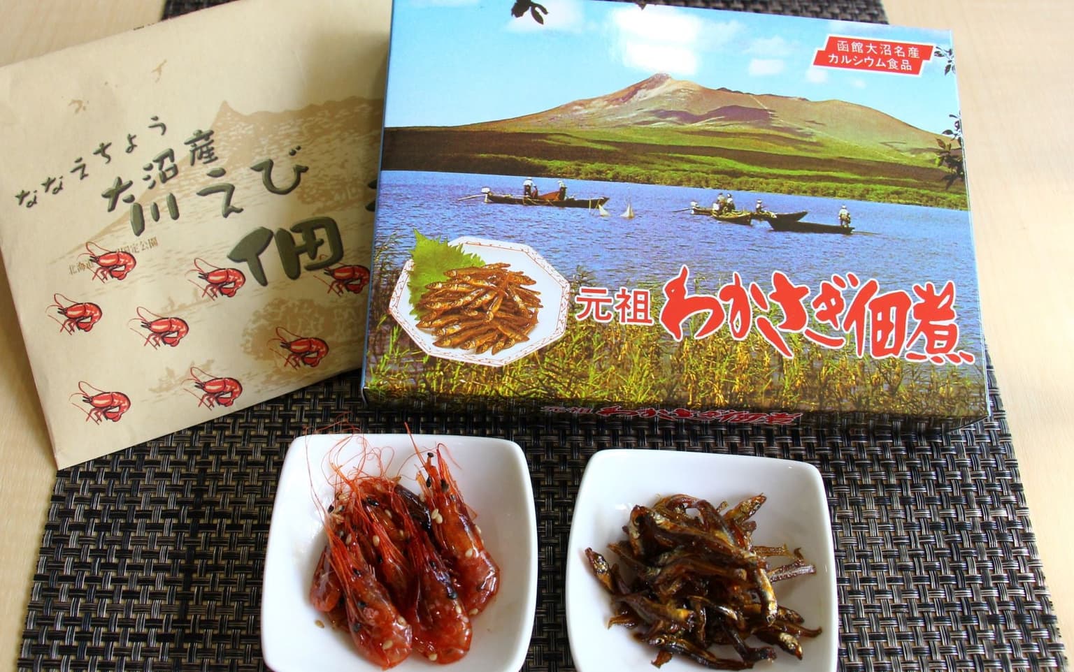 大沼湖で捕れたワカサギや川エビなどを加工・販売しています。わかさぎの佃煮や川エビの佃煮はお土産物としても大人気。大沼公園周辺のお土産物店や道の駅、函館市内のお土産物店などで購入できます。