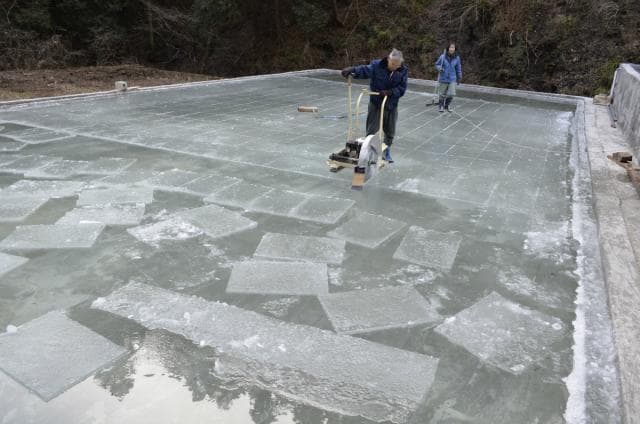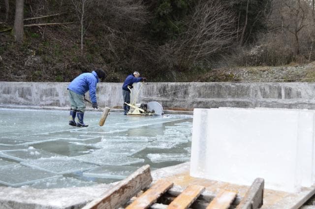 山の湧水を溜め、冬の寒さで凍らせて氷を作る。