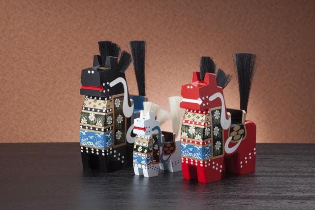 華やかな模様は、この地方の農村で嫁入りする際の乗馬の盛装を表したもの。日本三駒のひとつにも数えられ、福を呼ぶ馬として、結婚や新築などのお祝いや記念品としても親しまれています。