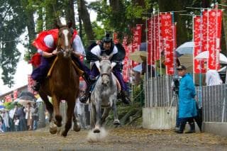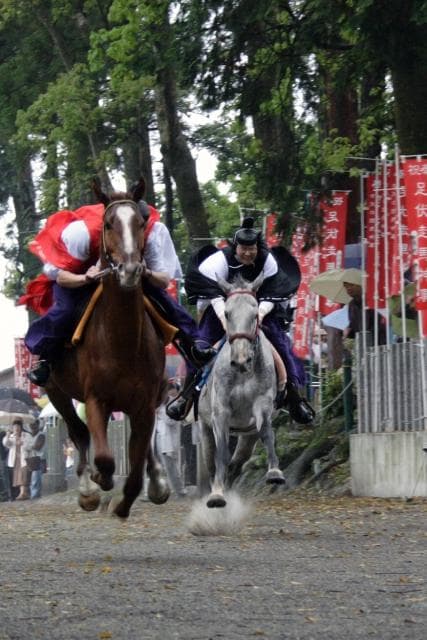 賀茂神社は、天智天皇により全国初の馬の国営牧場が造られた地に、天平8年(736年)、聖武天皇の勅命によって創建されました。境内の馬場にて、古式の衣装をまとった騎手が7頭の馬を駆り、2頭ずつ、トーナメント方式にて順位を決します。神事終了後には草競馬も行われ、深緑の木々の間を馬たちが颯爽と走り抜けます。