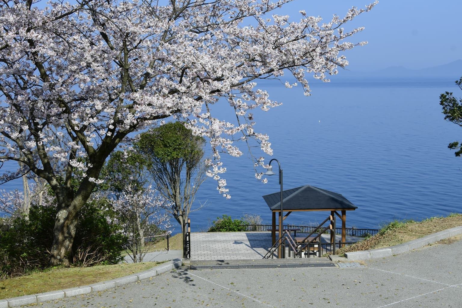 桜の名所100選に選ばれている湯の児チェリーラインは、湯の児温泉近くの不知火海に面した道沿いにソメイヨシノが咲き誇ります。