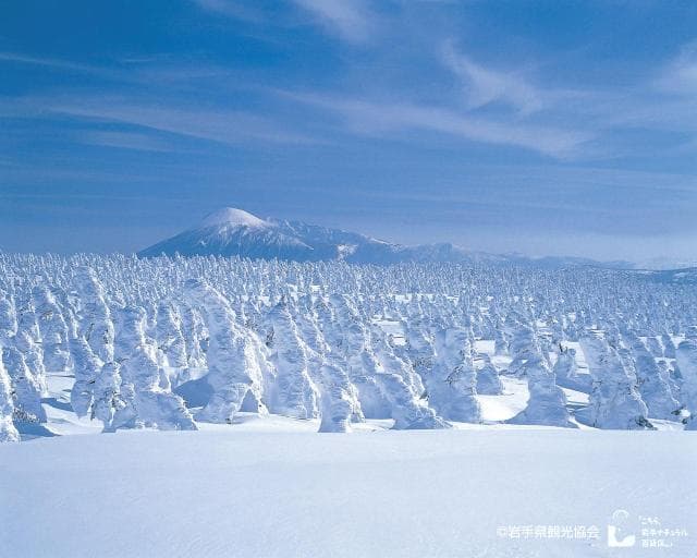 源太森から八幡平頂上,見返峠付近のアオモリトドマツの樹海は,12月いっせいに壮観な樹氷原となる。※ガイドと行くことをおすすめ。