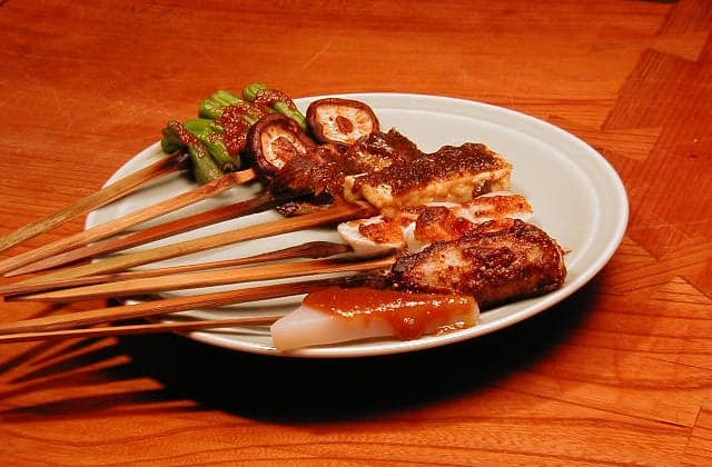 身欠きにしん,里芋,厚揚,しんごろう餅などを串にさし、炭火で焼いてみそを塗ったもの。里芋には砂糖みそ,厚揚やニシンには山椒みそ,コンニャクにはユズみそと、何種類かのみそを使いわける。満田屋(0242)27-1345,お秀茶屋(0242)27-5100などで。