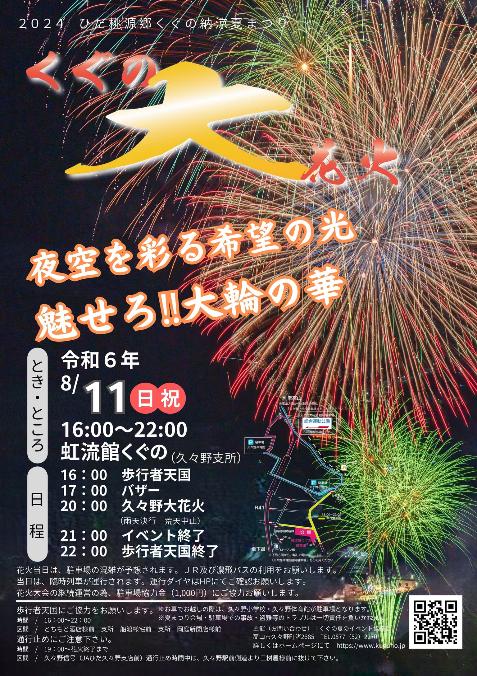 - 高山市久々野町「2024ひだ桃源郷くぐの納涼夏まつり」が、今年も8月11日(日・祝)に開催されます。「くぐの大花火」は20:00~の予定です。