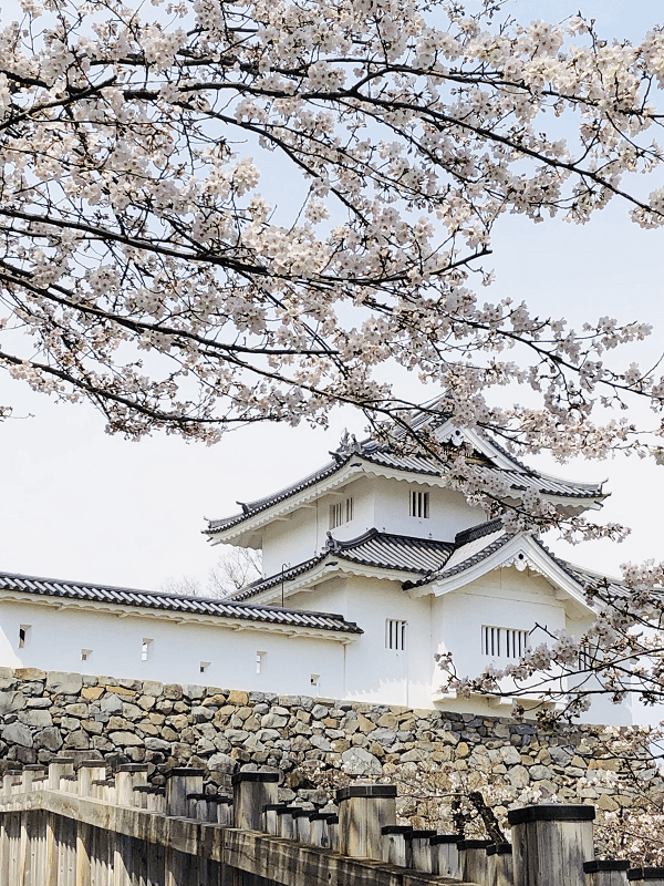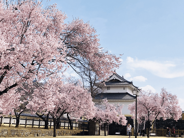甲府駅から徒歩3分の市中心街にある舞鶴城公園には、舞鶴城桜150本を超える桜が植えられていて、古い石垣やお堀など、城址の雰囲気とともに咲き誇る桜が楽しめます。
