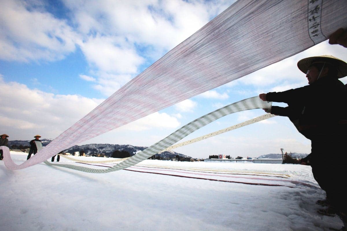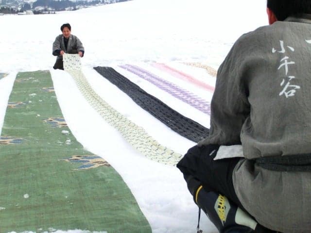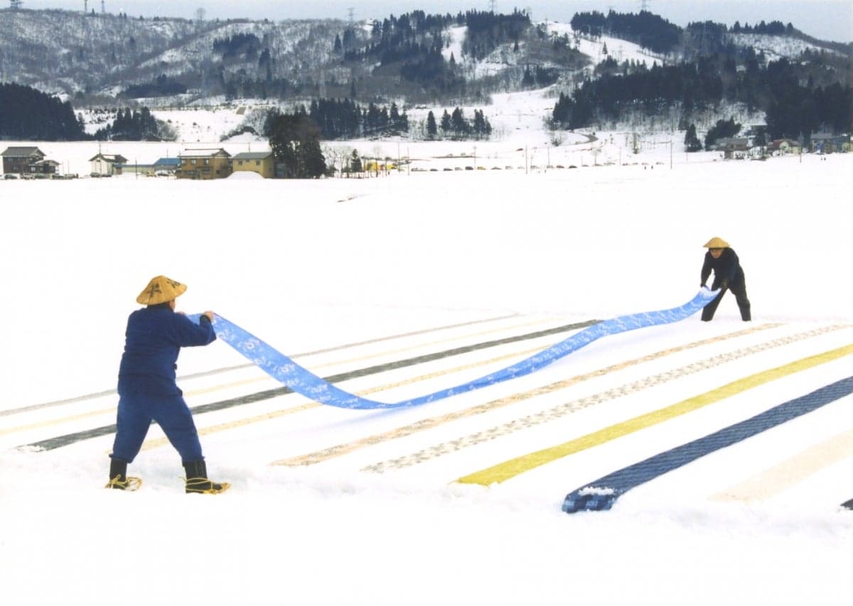 雪ざらしとは、小千谷の名産麻織物「小千谷縮」を作るために必要な工程であり、雪上にさらすことで麻生地が漂白される効果があります。