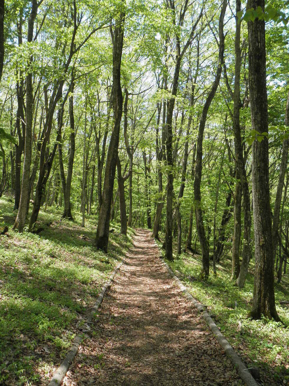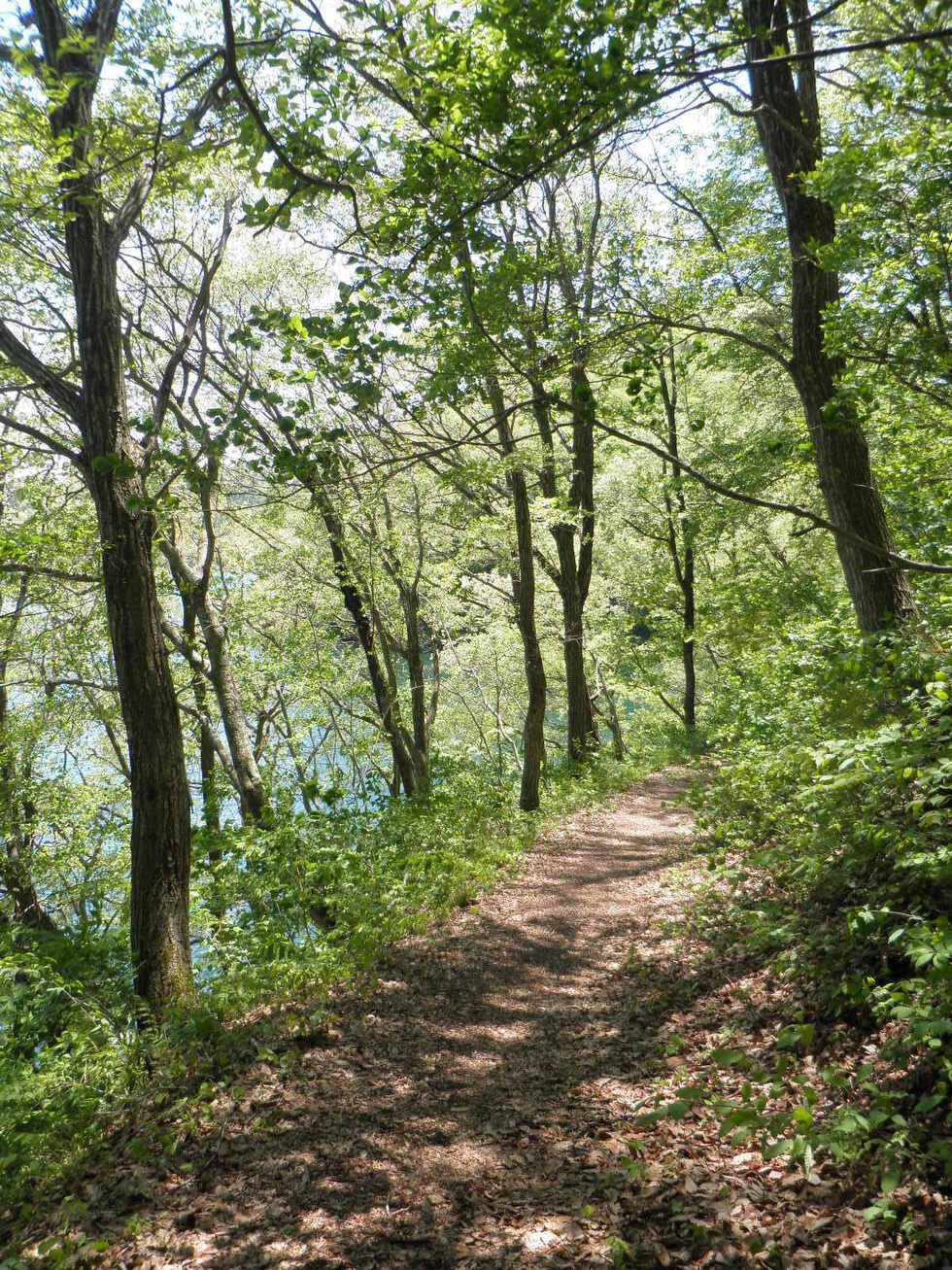 高低差が少なく、気軽に入ることができます。古くからのコナラやミズナラが圧倒的に多くヤマザクラ、クリ、ヤマボウシ等の広葉樹が特に目立ち、有名な「静かな湖畔の森の陰から♪」が生まれた岬も通ります。