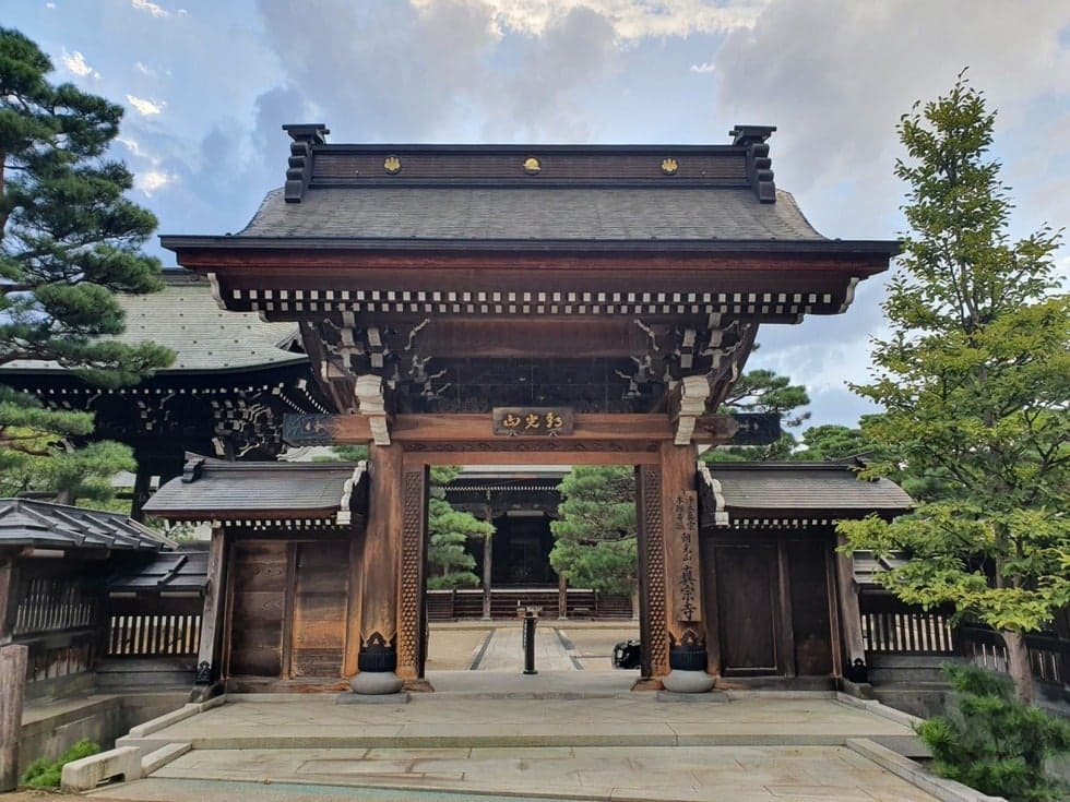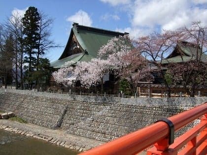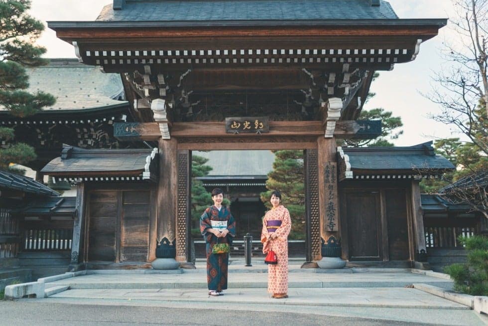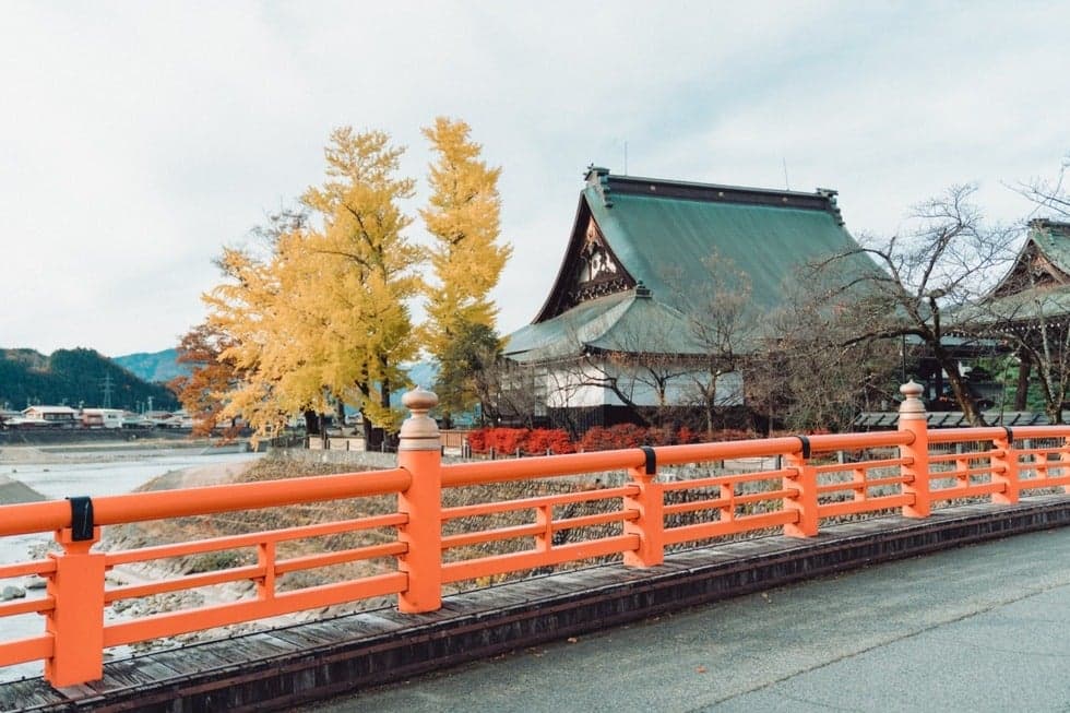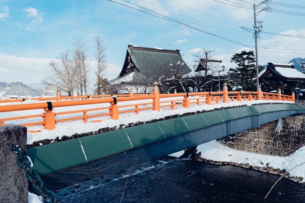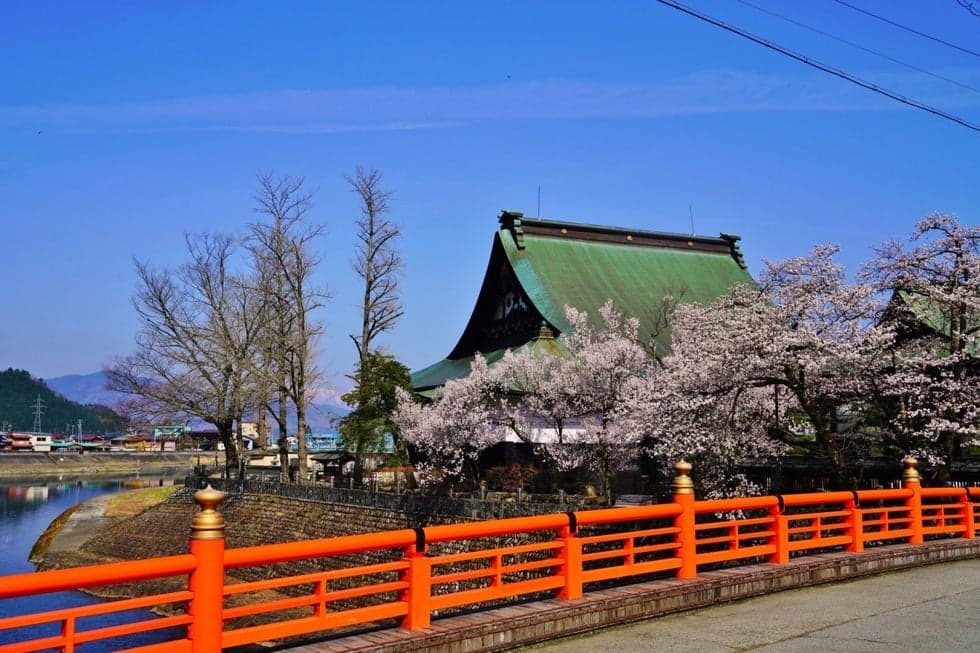 荒城川沿いに位置する真宗寺。もともとは浄土真宗 東本願寺派のお寺でしたが、宝永2年(1705年)に西本願寺派に転派したという歴史があります。毎年1月15日に行われる飛騨古川の冬の風物詩「三寺まいり」で巡拝するお寺の一つです。その荘厳な佇まいと、荒城川にかかる今宮橋の赤い欄干とのコントラストが美しいとことから撮影スポットになっています。春には川沿いを埋め尽くす桜、夏には深い緑、秋には美しい紅葉、冬には静かな雪景色という季節ごとに変わる周りの風景も一緒に味わいたい、趣深いお寺です。