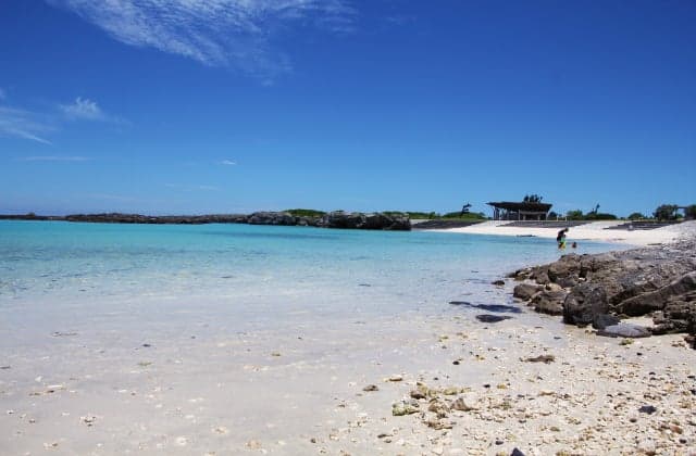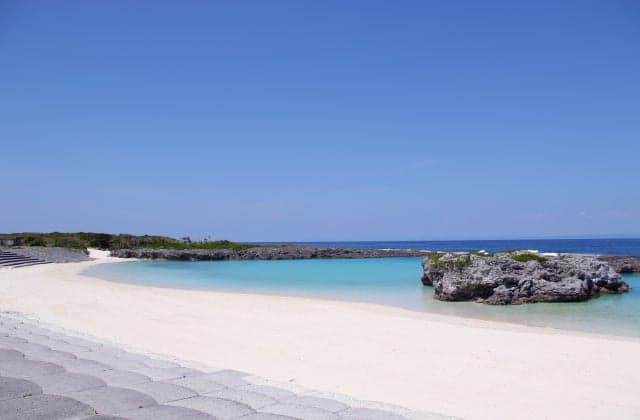 天然の入江を利用した人気の海水浴場です。周りがサンゴのリーフで囲まれているため波が静かで、潮の干満に関係なく、一日中海水浴が楽しめます。沖合に見える奄美大島に沈んでいく夕日を見ながら海水浴ができるのも魅力です。海水浴以外でも、バーベキューやグラウンドゴルフ、キャンプも可能です。