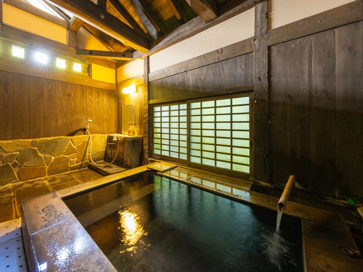 源泉かけ流しの温泉は、宿泊者だけが入れる特権。4つの貸切湯は、滞在中は何度でも楽しめるというのが贅沢。一度は泊まりたいのが古民家風離れの客室「雪竹庵」で、3つの部屋と専用の石風呂があるため、家族2世代でも特別な旅を楽しむことができそうです。本館の「雪やなぎ」にも、客室に露天風呂が備わっています。とろみのあるお湯は、保湿効果が抜群。温泉成分が皮膚に吸着しやすいため、入浴後の乾燥を抑えてくれると喜ばれています。