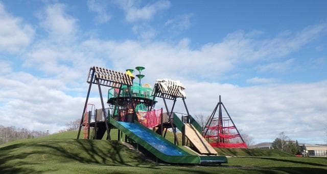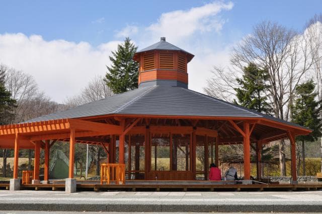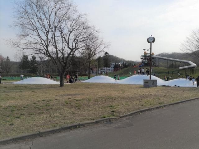運動公園、キャンプ場、桜、足湯、大型遊具、ふわふわドーム、紅葉。