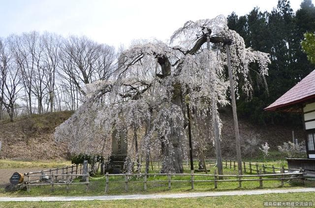 満開になると、長く垂れた枝に赤味がかったピンク色の花が無数につき地面につくほど枝が垂れさがるさまは、まるで滝を思わせる見事な景観です。樹高17メートル、根回り6メートル、推定樹齢300年。