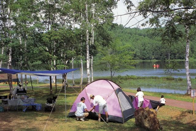 森林に包まれた湖では、カヌーや魚つりが楽しめます。