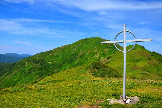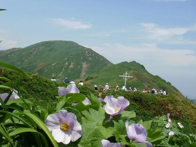 日本三百名山、花の百名山で渡島半島南西部では最高峰で標高1,072m。1896年(明治29年)に北海道で最初に一等三角点が設置された山で、日本三百名山のひとつです。山頂からは駒ヶ岳、函館山をはじめ、日本海に浮かぶ奥尻島や渡島大島、さらには津軽海峡をはさみ青森県の八甲田山、岩木山までもが一望できます。また、1693年(寛永16年)松前藩による隠れキリシタン処刑によって106人が殉教した地でもあり、金山番所跡と千軒平の尾根には十字架が建てられています。毎年7月の最終日曜日にはキリスト教徒殉教ミサが行われます。