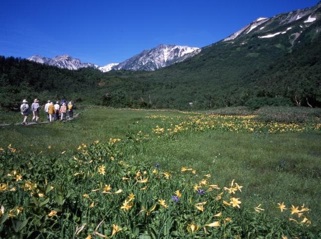 夏の太陽の色、ニッコウキスゲは、自然園内を鮮やかに彩ります。浮島湿原とモウセン池周辺に特に群生して見られます。水芭蕉湿原の一部100mほどバリアフリーになりました。