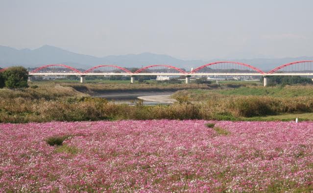 吹上の荒川堤防上を壮大な景色を眺めながら歩けます。5月のポピーや10月のコスモスをお楽しみ下さい。