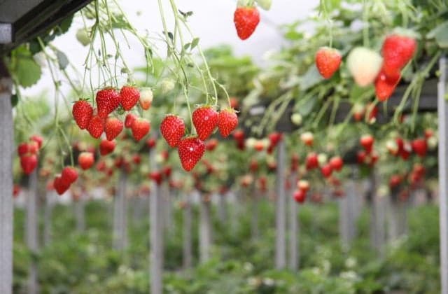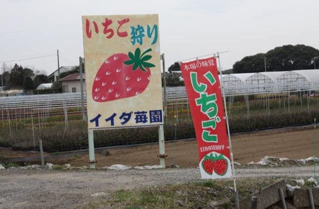 イイダ苺園では、いちごの王様アイベリーを土耕栽培だけでなく、立ったまま食べられる水耕栽培もしています。水耕の棚では、障害者の方、車イス、ベビーカーの方でも安心していちご狩りを楽しめます。アイベリーのほかに、ふさの香、紅ほっぺを栽培。