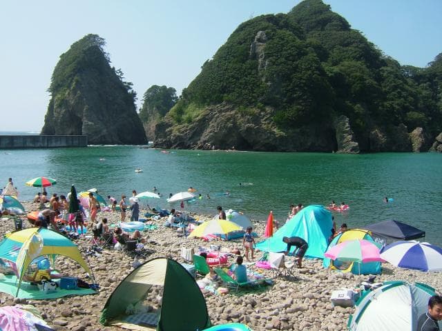 石浜のこぢんまりとした海水浴場。水質がよく透明度も高いため人気がある。前面に浮かぶ尊之島へは泳いで渡れる。海岸付近の洋上でシーカヤックやシュノーケリングで海の景色を楽しめる。