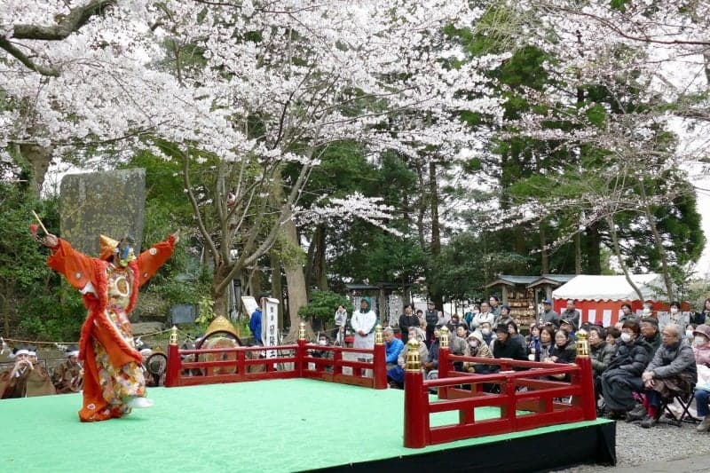 神社境内に特設の舞台を設け、桜の花を愛でながら、玉前雅楽会による雅楽が奏されます。