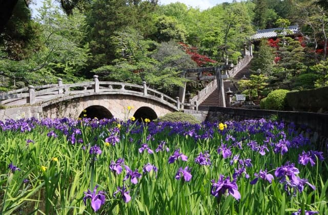 神社の境内にある池一面にカキツバタが咲き、池に架かる眼鏡橋とともに独特の景観を生み出します。