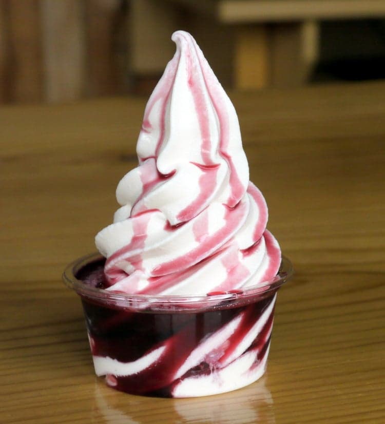 売店ではワインの試飲や購入もでき、ミルクソフトに久住ワイン「巨峰ロゼ」を大胆にかけたワインソフトクリームは、新感覚のソフトクリームです。ノンアルコールバージョンはワインの代わりに「葡萄ジュース」をかけています。