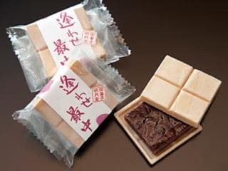筑西市優良産品推奨品。 『逢わせ最中』は、皮とあんが別になっており、パリパリの皮にしっとりとした粒あんが美味しい一品。明日堂こだわりの自家製粒あんは、最高級の十勝産小豆を使用してます。より豊かな風味をお楽しみいただくため、必ずお召し上がり直前に皮とあんをあわせてご賞味ください。
