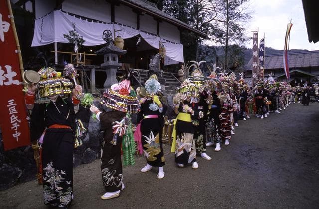 別称「鳥毛打」と呼ばれる飛騨独特の神事。鳥毛のついた花笠をかぶり、色模様の着物姿で拝殿いっぱいに円を描き、中に「おんどり」を意味する太鼓打ち、外周には「めんどり」の鐘打ちがたち、古風な歌をうたいながら舞う。