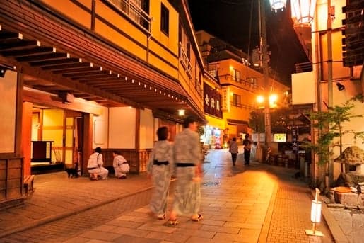 木造の建物と石畳で整備された温泉街は浴衣と下駄が良く似合う。九つの外湯めぐり(宿泊者のみ)も人気です。