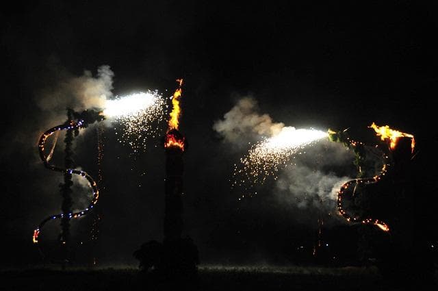 虫送りの「虫」は龍蛇体状の物で頭は主に木造り、胴は藁で造られ、大きい物では10メートル、小さいものは1メートルぐらいです。昔の稲作りは部落単位で行っていたため、部落に入る場所の高い木などには大きい虫を揚げ、また水路には小さい虫を流し、「早苗振」等の行事・祭りが催されます。祭りが終わると、部落の出口にまた虫を揚げ、虫除け、豊饒を祈ったとされています。虫送りと火まつりはこれら伝統の儀式を現在に深く活かすため、始められたものです。