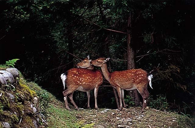 小さな体が特徴的なヤクシカは、ニホンジカの亜種。標高1000m以上の山間部や西部林道はもちろん、里地でもその姿を見ることができる。