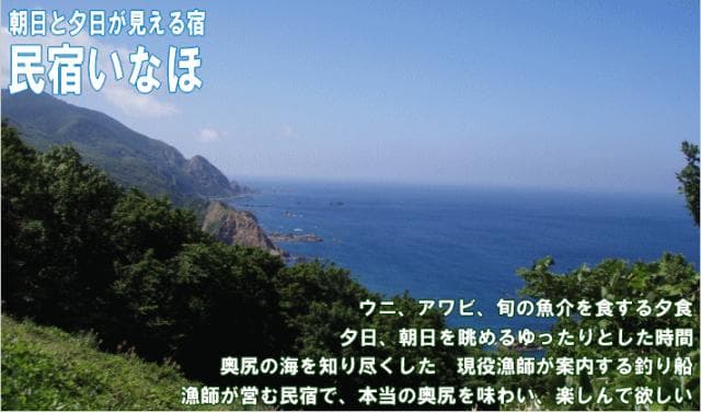 奥尻島最北端である稲穂地区で1軒の民宿です。自慢はなんと言っても食事です。漁師が営む宿なので、鮮度にこだわった旬の魚介が味わえます。