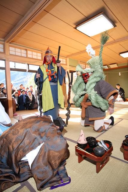 毎年1月3日、発光路の鎮守である妙見神社の祭り当番受け渡しにともなって行われる儀式。立烏帽子に袈裟衣姿、金剛杖を手にした山伏と、強力面をかぶり、藁の鉢巻とタスキをかけ、太いザクマタの「責め棒」を手にした恐ろしげな「強力」登場する。そして新旧の太夫(祭り当番)や来賓者、氏子の人々に対してユニークな口上を述べ、高盛飯を強いた後「責め棒」で首根を押さえて祝う。祭りを引き継ぐ村人として望ましい資質を育てる性格を持った重要な行事である。(2022年開催中止)