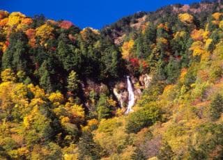 上高地へ向かう国道の車中から見える滝。紅葉の頃、まわりとのコントラストがすばらしい。