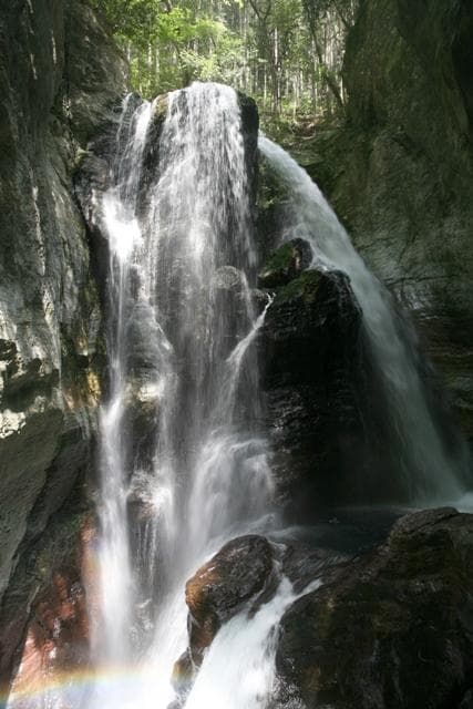 渓谷に沿遊歩道を奥の方へと進んでいくと、目の前にそびえ立つのが「雨竜の滝」。雨竜の滝は、滝壺そのものが虹色がかった岩でできておりますが、天候や時間帯によっては本物の虹が現れ、幻想的な風景を楽しむことができます。過去10年のうち7回も水質が日本一に選ばれている仁淀川の「仁淀ブルー」とそれを生み出す美しい自然を肌に感じながらハイキングをお楽しみいただけます。