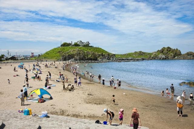 ウミネコの繁殖地として国の天然記念物に指定されている蕪島の隣にある海水浴場。市街地から近い場所にあり、多くの海水浴客でにぎわいます。