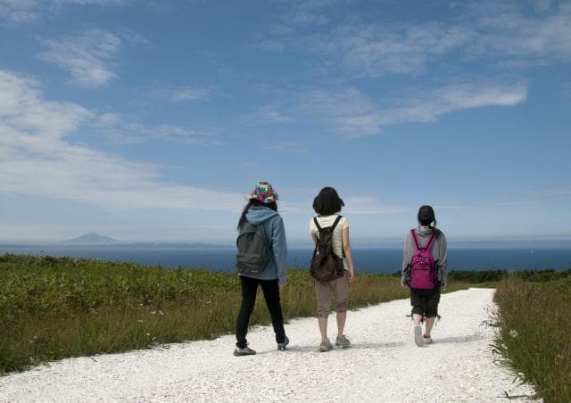 宗谷さんのホタテの貝を敷き、足にやさしい、自然にもやさしいものとなっております。また、ホタテの貝殻の白と空の青、白い道周辺に生える草の緑からなるコントラストはとてもきれいです。