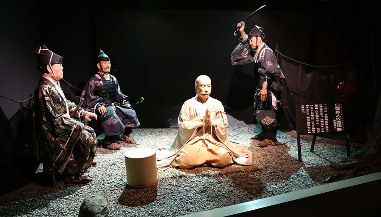 佐渡の歴史や伝説を等身大ロボット人形がリアルに再現。1階は、順徳上皇の配所の月、日蓮聖人の塚原問答、世阿弥の雨乞いの舞など、有名なシーンを精緻な動きで伝えます。2階には佐渡の風土をテーマにした写真とオブジェを設置。人間国宝・佐々木象堂記念館(蠟型鋳金)も併設。佐渡の味覚を味わえる食事処も人気です。