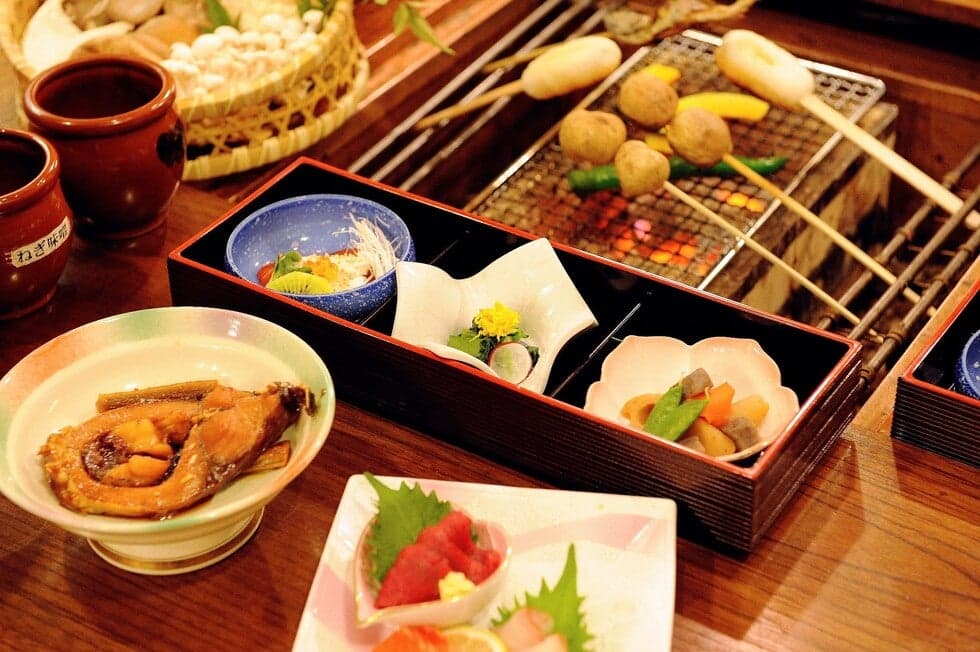 高台にある為お部屋からのロケーションは昼神一。春は川沿いの桜、夏は祭りの花火、秋は山々の紅葉、冬は雪化粧の庭園と楽しみが尽きません。そんな四季折々の表情を見ながらお部屋で郷土の素材を使った会席料理をお召し上り頂く事も可能です。また、宿名「ユルイ」にちなんだ「囲炉裏料理」も自慢の一つ。囲炉裏風の個室食事処で炭火を使い地元の山の幸をお好みの焼き加減で召し上がれます。