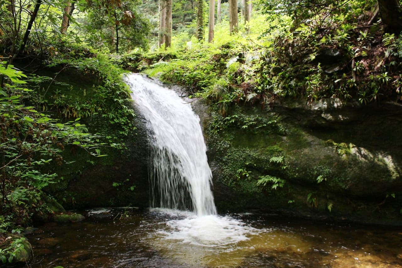 岩間を流れる清流、鬱蒼とした杉木立や広葉樹の中でキャンプを楽しめます。