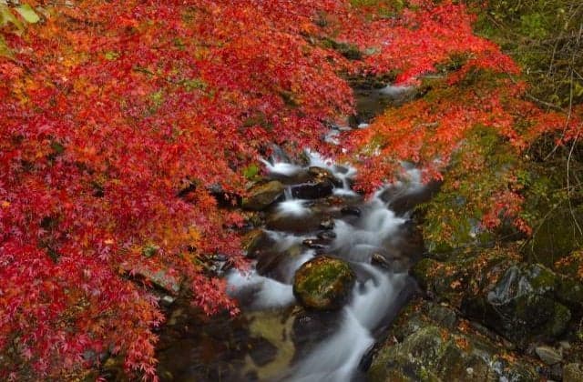 花園花貫県立自然公園に指定されている自然豊かな渓谷。秋の紅葉スポットとしては勿論、春のシャクナゲや初夏の新緑も有名で、四季を通じて楽しむことができる。特に、ナラ、カエデ、イヌブナ、ヤマモミジ等が色づく様は美しく、赤や黄色に染まった葉が舞い落ちて渓流をすべる様子は、秋の風情を感じることができ、絶好のフォトスポットとなっている。道幅が狭い箇所もあるので通行には注意が必要。