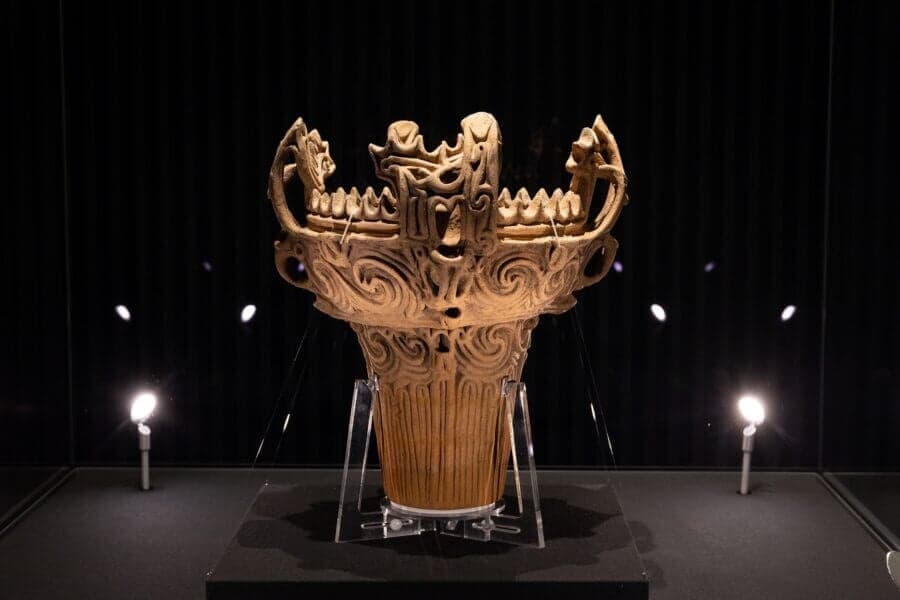 火焔型土器は今から約5,000年前の縄文時代中期に造られた土器で、大きく立ち上がる突起が、燃え盛る炎のように見えることから命名されました。