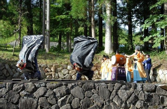 数河獅子は「曲獅子」「天狗獅子」「金蔵獅子」の三段から構成され、ユニークで独特な踊りを舞います。祭礼の1ヶ月前から村の古老が毎晩出演者の指導にあたり、その伝統を今に継承してきた歴史ある例祭です。