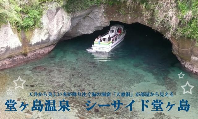 堂ヶ島の名勝「天窓洞」を眼下に見下ろすことが出来る唯一の宿です。絶景に目が満足し、地魚料理にも舌も満足。そして心の温もった家庭的なサービスと、天然温泉に心も満足!2名様以上には舟盛り活造りのサービスがあります。