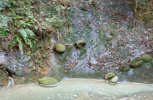 子供が生れるように、岩肌から石の玉が突き出してくるという「子生れ石」。川の壁面には、ボールを埋め込んだような石の姿や、川原には直径60センチほどの丸い石やまゆ形の石があります。縁起の良い石として知られ、パワースポットとしても注目されています。