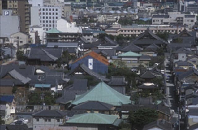 近世の城下町で、寺院が集中している町を寺町という。元和3年(1617)、尼崎藩主・戸田氏鉄が尼崎城を築く際、城下町を整備するために散在していた寺院を城の西に集めたのがここの寺町の起こり。寛永12年(1635)の現在最古の尼崎城下絵図では20カ寺の名が確認されているが、現在は3.9haの地域に11カ寺が軒を連ねる。阪神電鉄尼崎駅からすぐ、大市街地の中心部にありながら今日に至っている貴重な文化遺産である。
