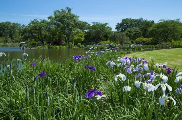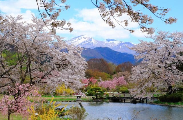 秀峰安達太良を背景に清流五百川に隣接した、約3万坪に及ぶ自然型池泉回遊式の花庭園。