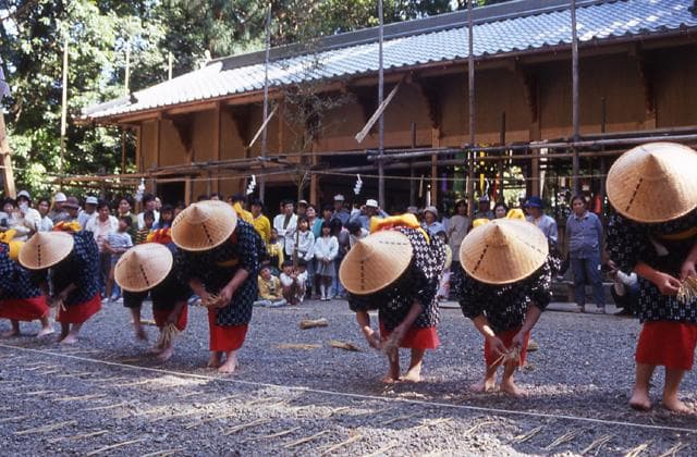 稲成町の伊作田(いさいだ)稲荷神社の神事。水田に見立てた境内で、神主がお祓いをし巫女が神楽を舞った後、草刈り、しろかき、稲刈りまでの作業を氏子らがユーモラスな仕草で演じます。